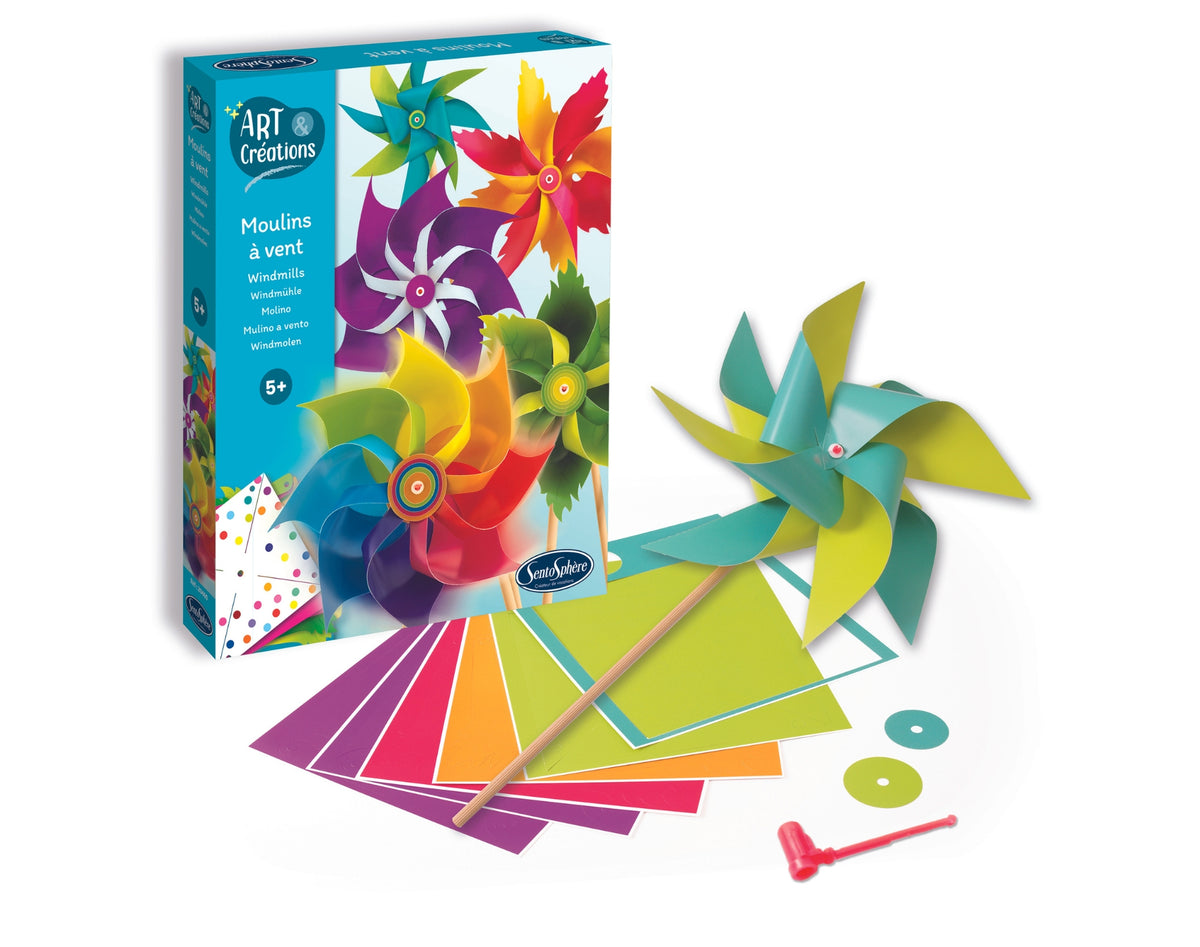 Szép kétszínű szélforgók, amelyeket előre perforált papírlapokból készítenek, elöl és hátul nyomtatva.