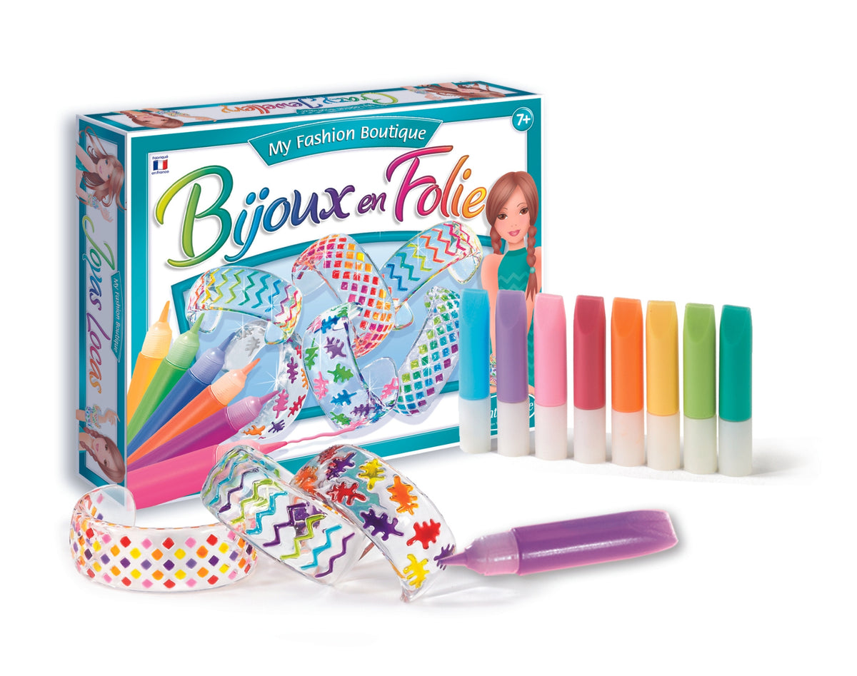 Ez a készlet 3 átlátszó karkötőt tartalmaz, amelyeket 10 csillogó szín segítségével lehet befesteni és újrafesteni mintákkal. A festékréteg éles eszközzel eltávolítható, hogy új színek felvitelét tegye lehetővé.