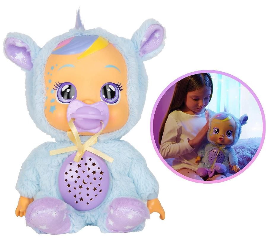 Cry Baby Goodnight Starry Sky Jenna különleges funkciókkal rendelkezik, amelyek megnyugtatóvá és varázslatossá teszik az alvásidőt. Ha elveszed a cumiját, sírni kezd fényekkel, amelyek világítanak, és valósághű baba hangokat ad ki. Ha visszaadod a cumit, abbahagyja a sírást. Ha megnyomod a puha pocakját, aktiválódik a csillagos égbolt vetítése, amely bármely helyiségben megjeleníti a csillagokat és a holdat. Ezenkívül több mint 10 perc megnyugtató altatódalt játszik le, amelyek pihentető légkört teremtenek az alváshoz.