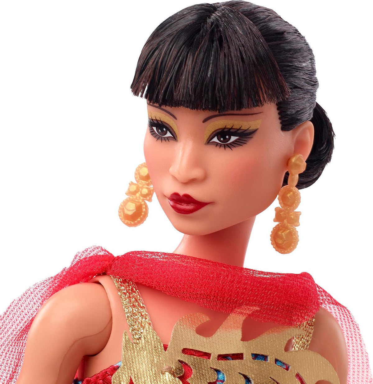 - A Barbie baba Anna May Wong gazdag piros ruhát visel, arany sárkánnyal a fűzőn. Csillogó arany pántok és áttetsző vállkendők, drapírozott kivágással egészítik ki az elegáns megjelenést.
