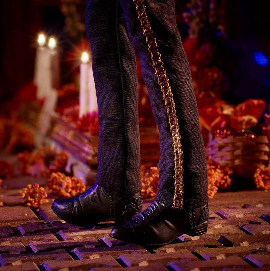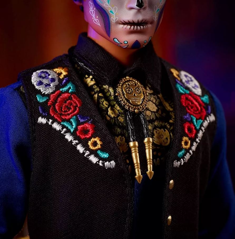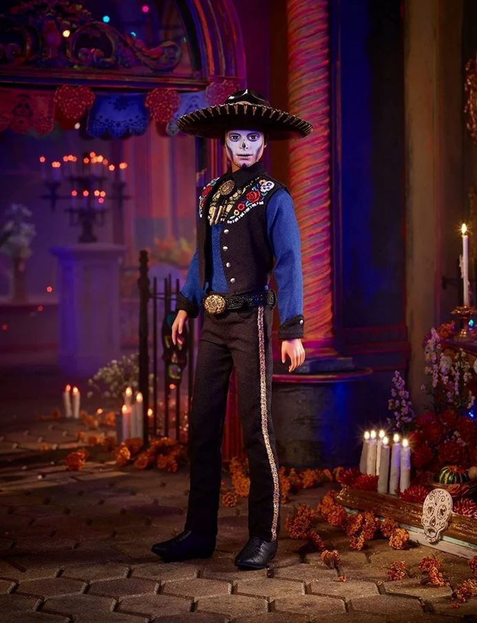 A baba tökéletes gyűjtőknek és ideális ajándéknak. Kiváló részletgazdagság jellemzi. A Charro stílusú Ken baba kék inget és mellényt visel, amelyet csillogó koponyák és virágos díszek díszítenek. Az öltözékét egy koponyamintás nyakkendő és egy arany szalaggal díszített sombrero teszi teljessé. A csomagolás kiállításra is alkalmas.