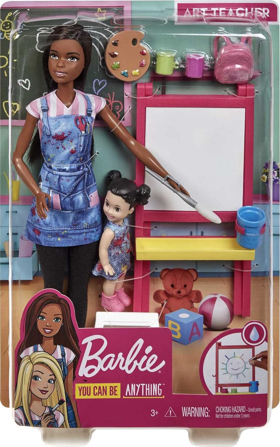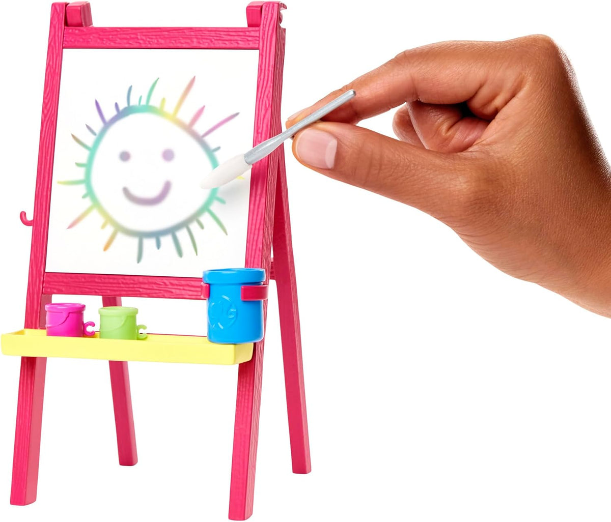 Barbie művész tanárnő megmutatja tanítványának, hogyan kell festeni egy állványon, amely meglepetést tartalmaz a színek változtatásához: mártsa a (tartozék) ecsetet vízbe, fessen az üres felületre, és a kép varázslatosan megjelenik! Ismételten alkothat, ha letörli a felületet. Barbie leggingsben, pólóban, tornacipőben és egy aranyos farmer kötényben van, készen arra, hogy tanítsa kíváncsi tanítványát, aki egy bájos ruhát és hátizsákot visel. A játék kiegészítők között szerepel az állvány festőfelülettel, festék- és víztartó edények, paletta, ecset és egy kis pad a tanítványnak.