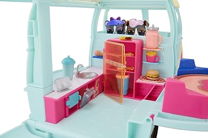 A babák elkezdhetik a bulit a lakókocsi színpadi oldalán csúszkálva, és kitehetik az asztalt és a székeket, hogy egy menő időt teremtsenek. Az 5 az 1-ben lakókocsi befogadja az összes kedvenc LOL Surprise babádat és háziállatodat. Amikor befejeztétek a játékot, az összes kiegészítőt bent tárolhatod, így könnyen magaddal viheted útközben.