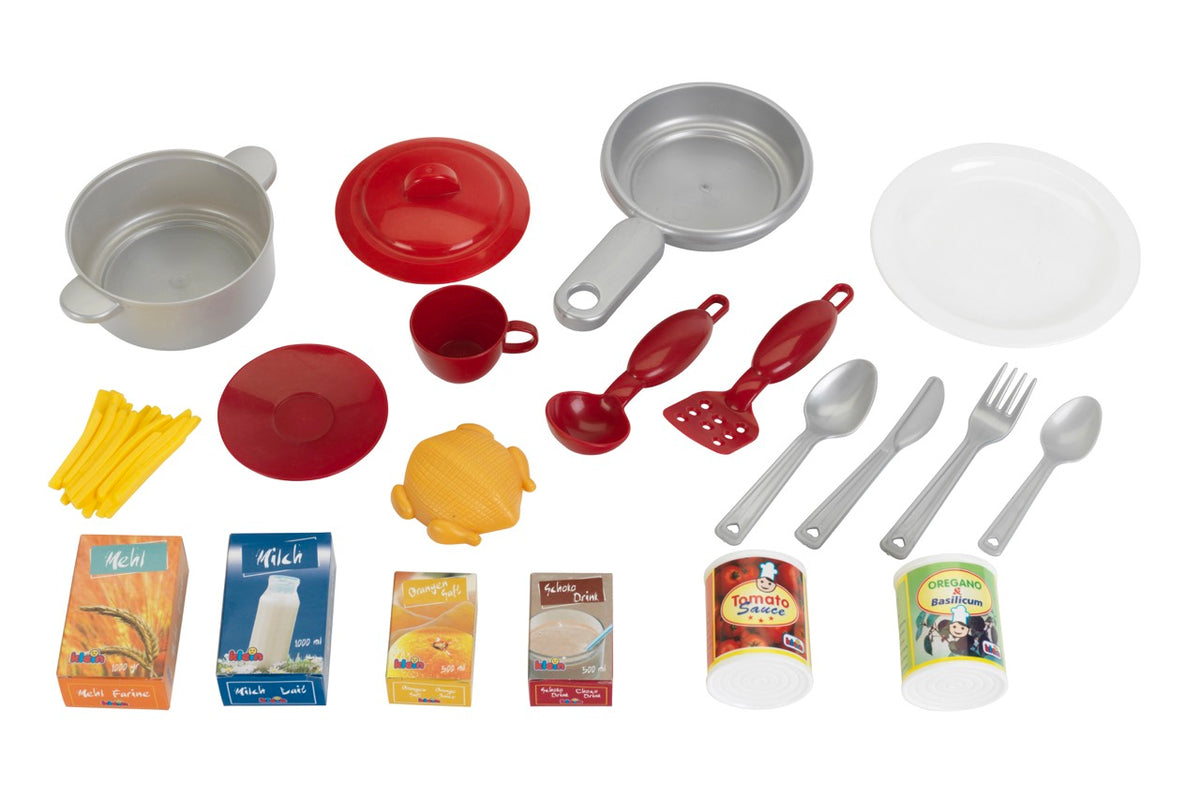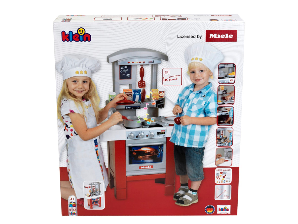 Miele konyha 'starter' Gyermek játékkonyha Miele dizájnnal, amely mindkét oldalról játszható, lenyűgözi a kis szakácsokat egy hangmodullal, amely elektronikus főzési hangokat ad, számos játéklehetőséggel és sok kiegészítővel. Tartalmaz egy sütőt, mosogatógépet, páraelszívót, mosogatót és egy praktikus tárolóhelyet. Tartozik hozzá serpenyő, fedeles fazék és konyhai eszközök (lapát, fakanál). Az evőeszközök, mint tányérok, villák, kések, kanalak, eszpresszó csésze, alátét és kávéskanál is részei a készletnek. És hogy a kis szakácsok a képzeletükben valamit elkészíthessenek, élethű élelmiszer utánzatok is járnak hozzá: sültkrumpli, fél csirke, négy ételcsomag és két konzervdoboz.