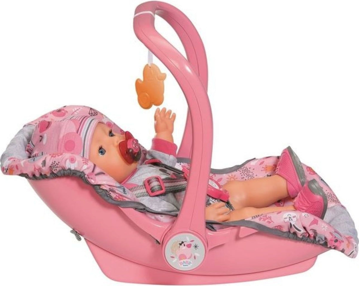 A kényelmes és gondosan megtervezett BABY born biztonsági ülésben az ülés lesz az új kedvenc tevékenysége. Egyszerűen fordítsa át a babahordozó fogantyúját, és máris tökéletes ülőhelyet kap. Így a kis felfedező kényelmesen figyelheti a környezetét. A biztonsági öv biztonságosan tartja az ülésben, miközben balra és jobbra fordul, és mindent megmutat maga körül. Néha azonban nincs mit nézni, ilyenkor a kicsi háton fekve pihenhet vagy játszhat a Berta kacsa játékfigurával. Amíg a BABY born kényelmesen fekszik, az anyuka és az apuka gond nélkül hordozhatja ezt a könnyű babahordozót. Ha a BABY born unatkozik, a hordozó hintaként is használható. A ringatás megnyugtat és örömet hoz, akárcsak a játékos huzat anyaga.